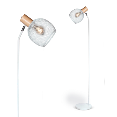 La?mpara de pie, malla meta?lica blanca o negra con madera. Para la?mpara E27 LED.