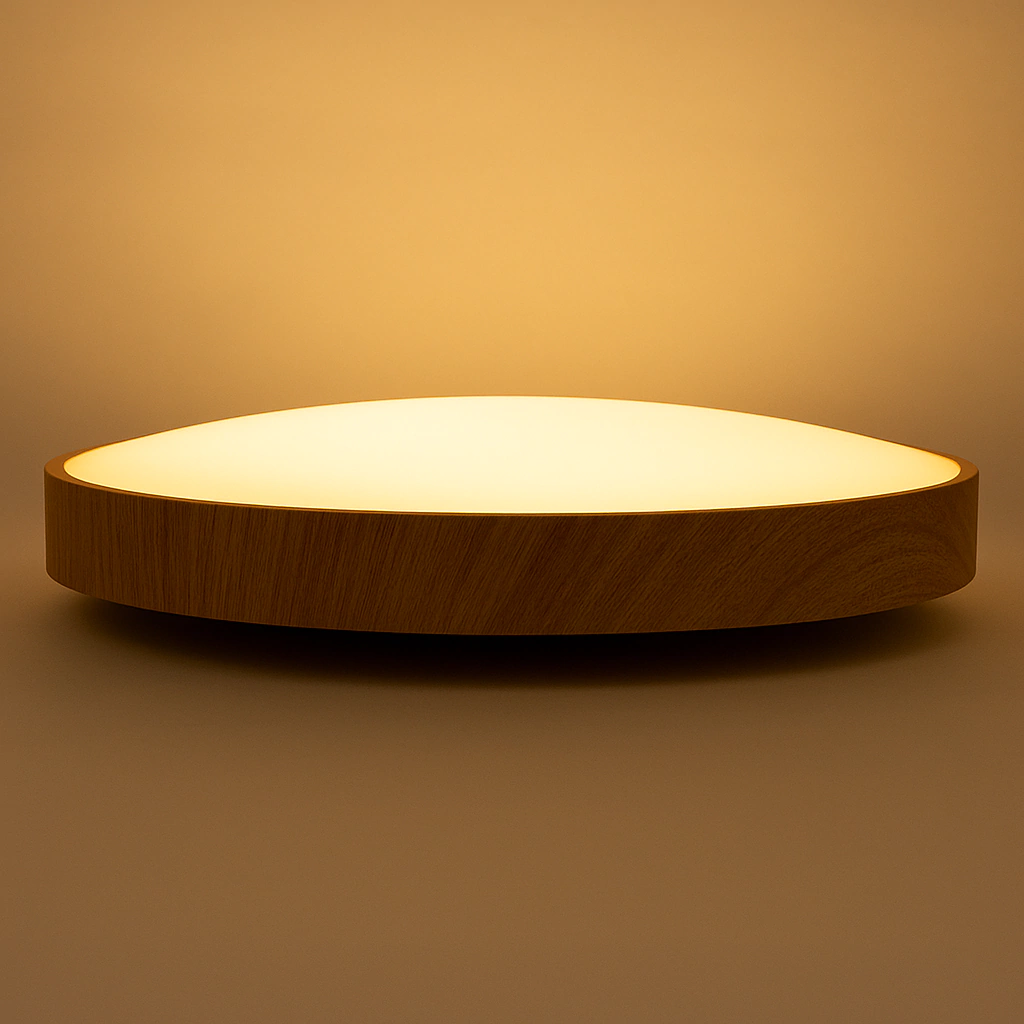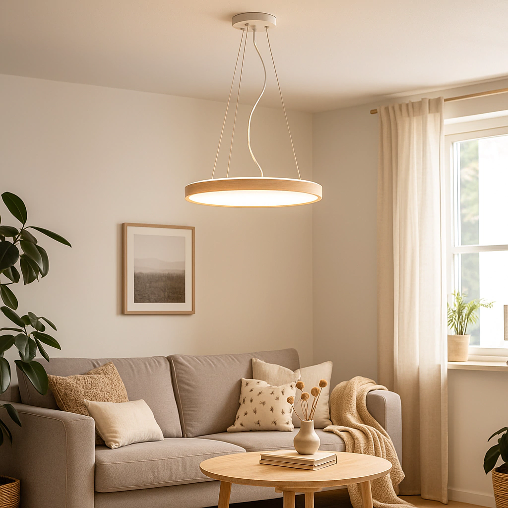 Diseño nórdico y líneas simples que aportan calidez y elegancia. Su terminación símil madera lo convierte en un colgante ideal para livings, comedores o espacios donde la luz y el estilo se integran naturalmente.