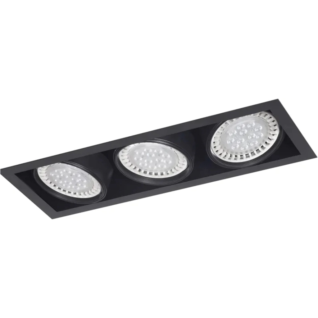 Embutido . Material: Aluminio y acero . AR111 x 3 . Color: Negro . Largo: 450 mm . Ancho: 150 mm . Profundidad: 90 mm . Con movimiento cardánico
