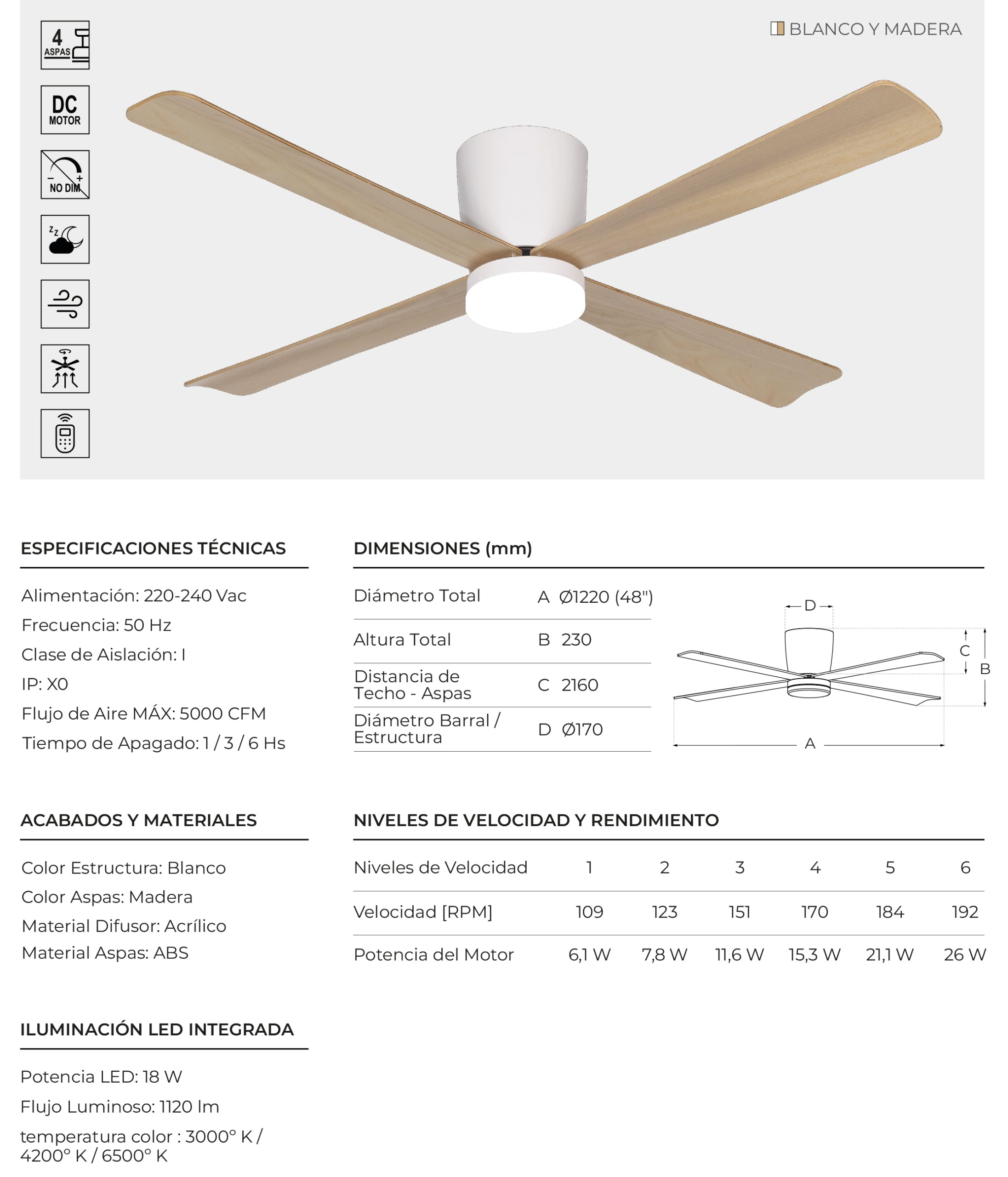 Ventilador Led 484 B Blanco + Aspas ABS Simil Madera Dim con Control 3 Temperaturas Led (3000k/4000k/6000k) Funcion Invierno 4 Aspas Laftdren (18W)