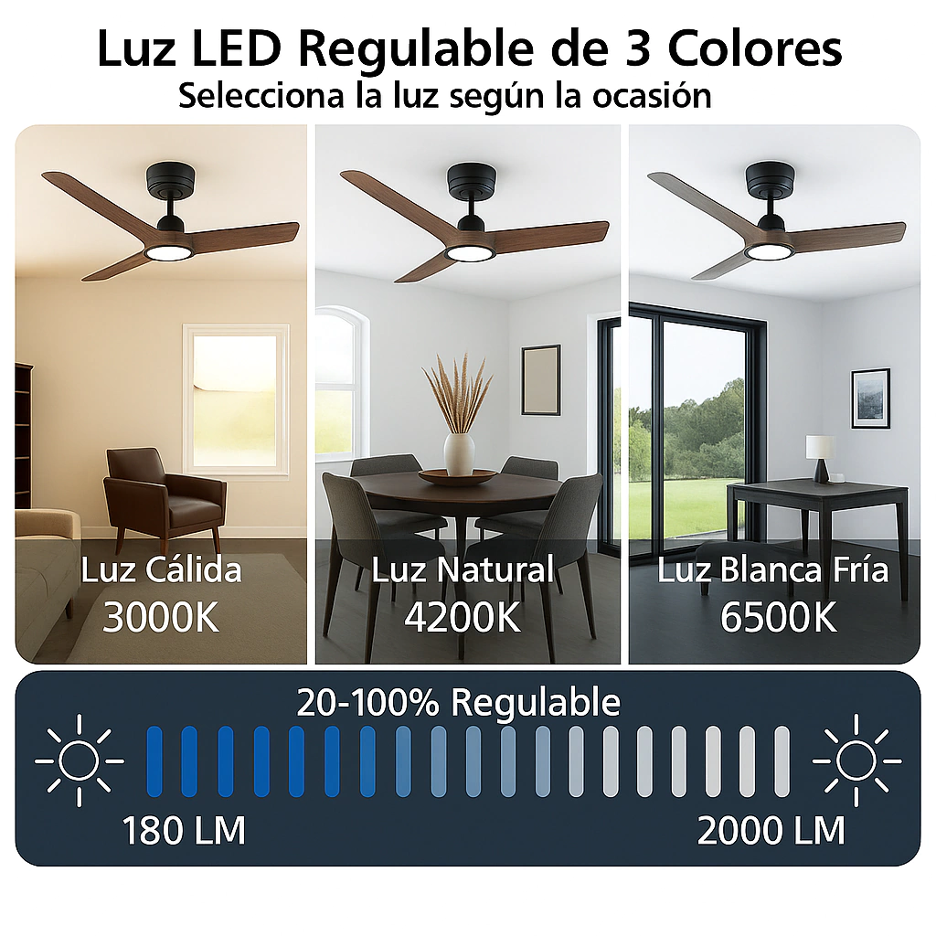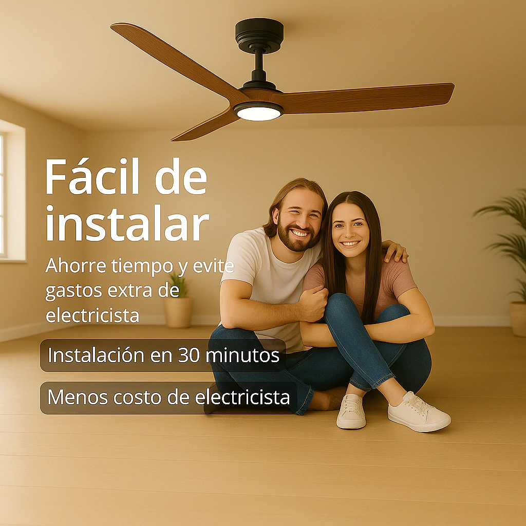 El ventilador LED de diseño BIXOR BX06 Negro y Madera combina iluminación regulable, motor DC de bajo consumo y control remoto multifunción.